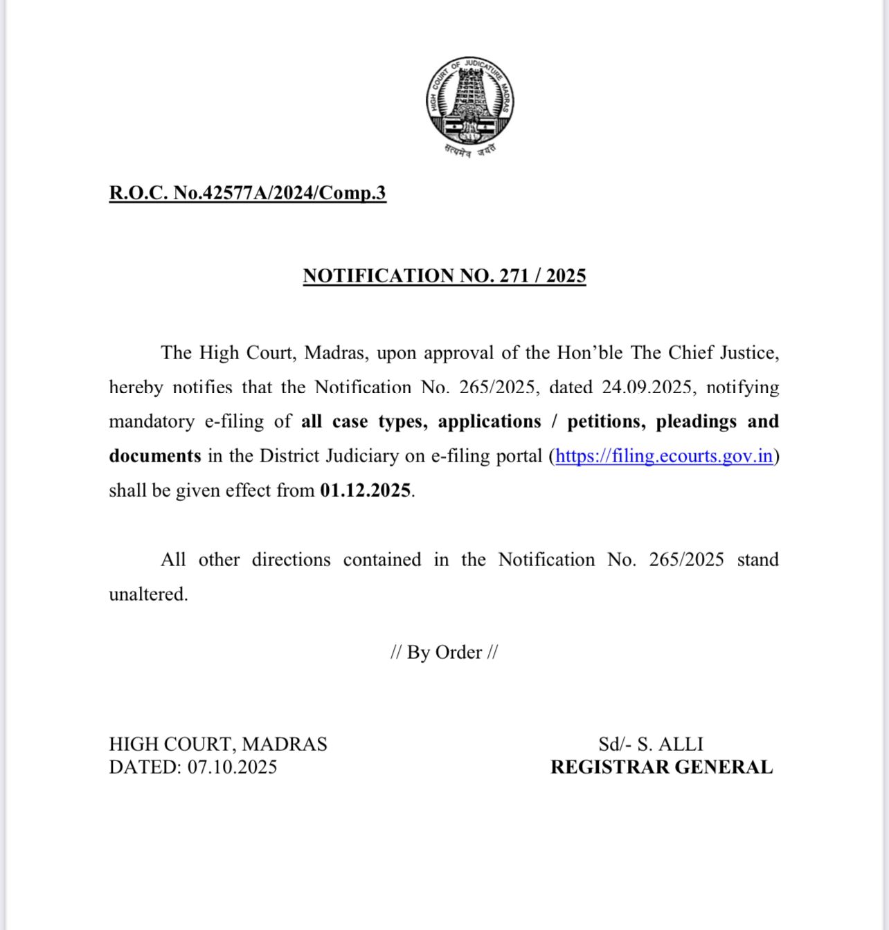 The High Court, Madras, upon approval of the Hon’ble The Chief Justice, hereby notifies that the Notification No. 265/2025, dated 24.09.2025, notifying mandatory e-filing of all case types, applications / petitions, pleadings and documents in the District Judiciary on e-filing portal (https://filing.ecourts.gov.in) shall be given effect from 01.12.2025.